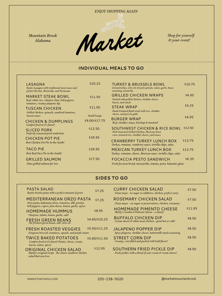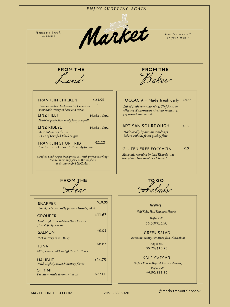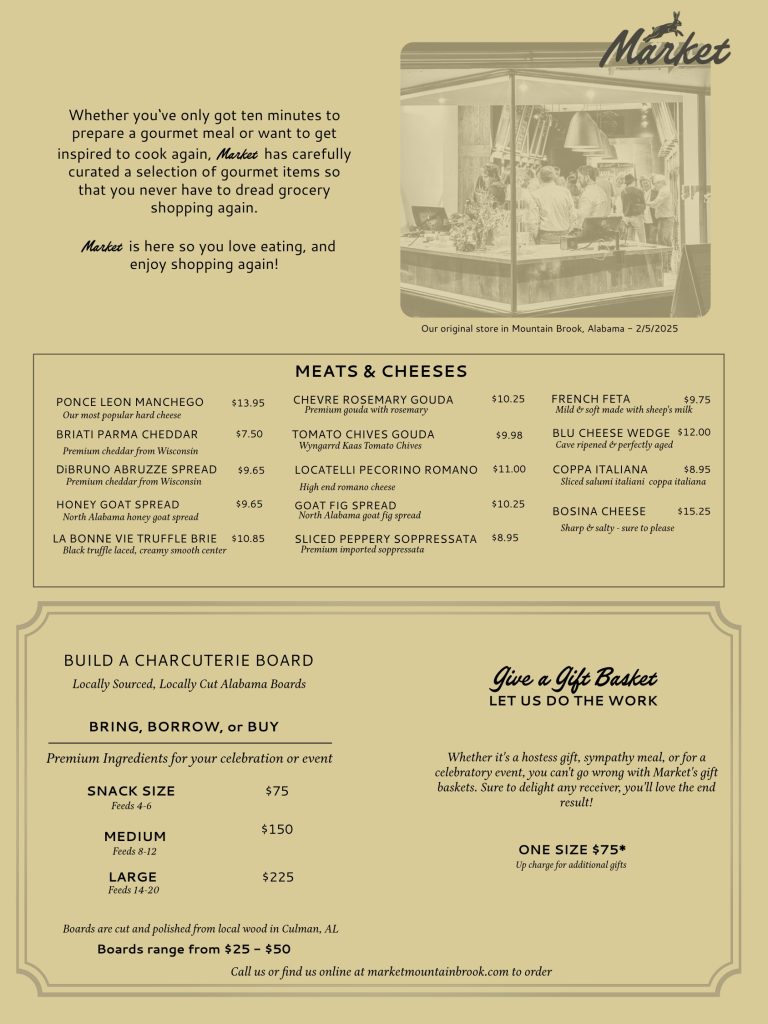 Don‘t waste another hour stressing in the grocery store or prepping a multi-course meal. Shop at Market in Mountain Brook Village for fresh, local food that inspires!